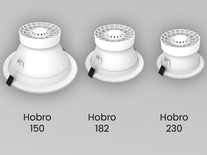 Hobro er et fleksibelt downlight-spot, særligt velegnet til renoveringsprojekter i bygninger med varierende eksisterende downlight-diameter. Spotlysets unikke design inkluderer en justerbar diameter, der spænder fra Ø150 til Ø230 mm, samt valgbare wattage fra 20 til 35 Watt. Derudover kan kelvin-grader justeres fra 2700 til 6000 for at skabe den ønskede belysning og atmosfære.
