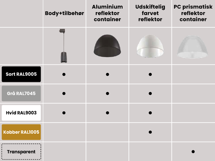 - Materiale: Sort RAL9005, Grå RAL7045, Hvid RAL9003, Kobber RAL1005