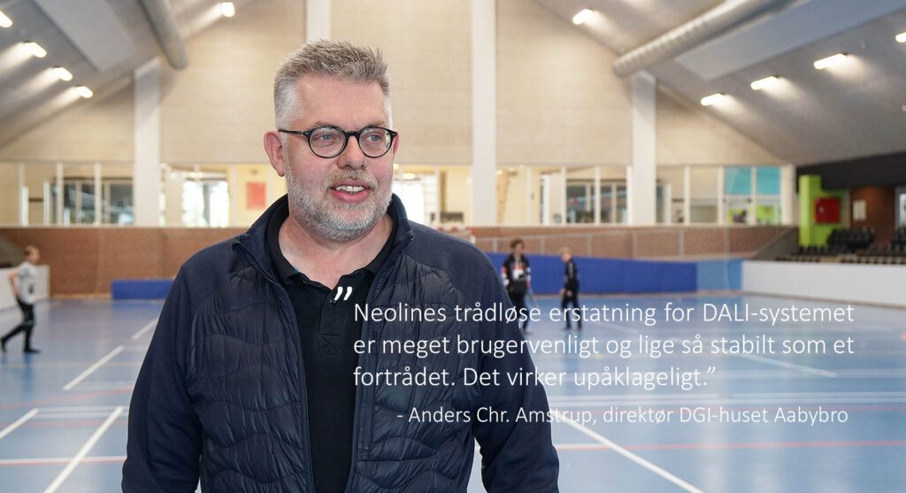 Lysstyrke reguleres med Neolines trådløse DALI-erstatning fra din computer, tablet eller smartphone. Løsningen leveres også med vægmonteret touch-skærm.
